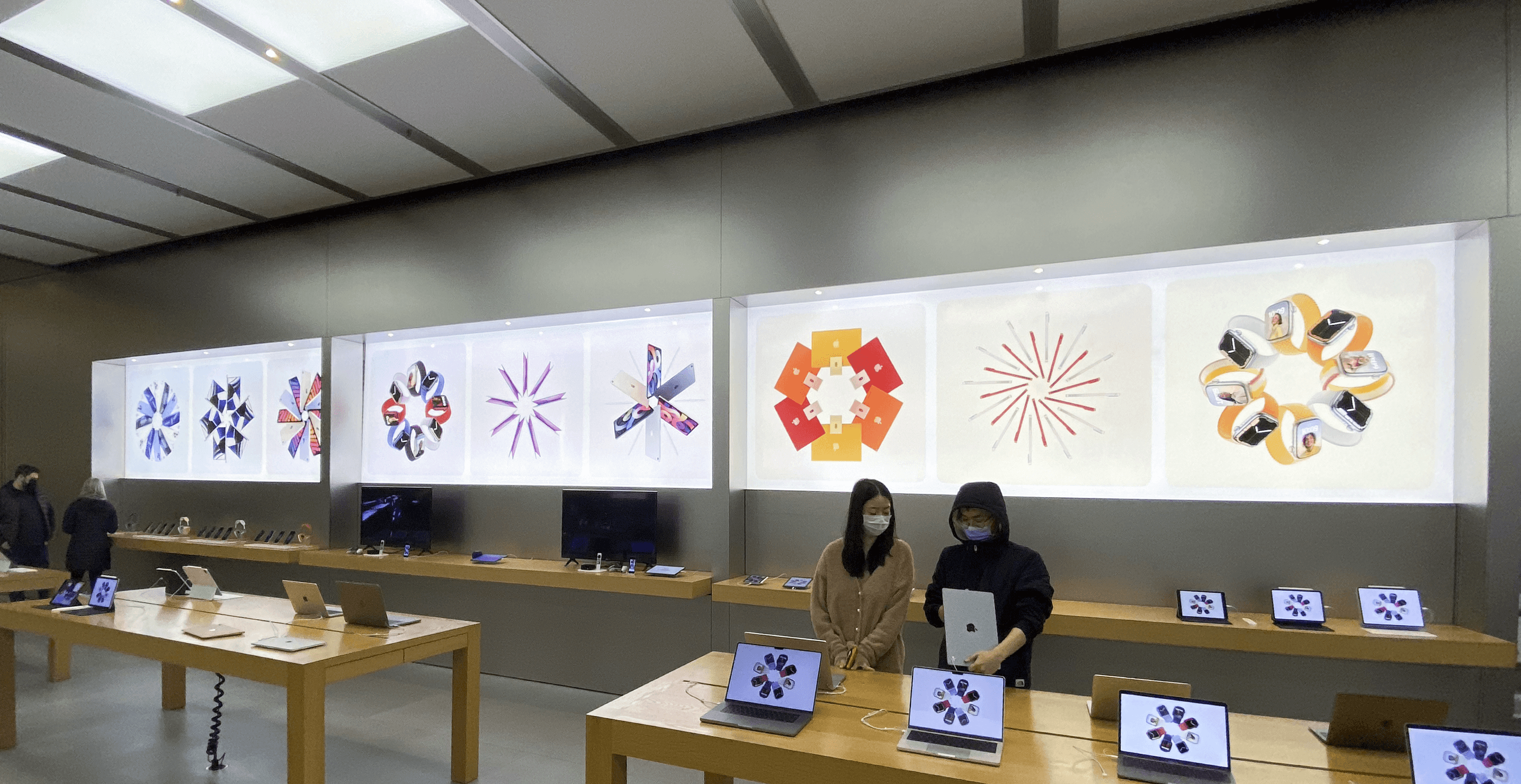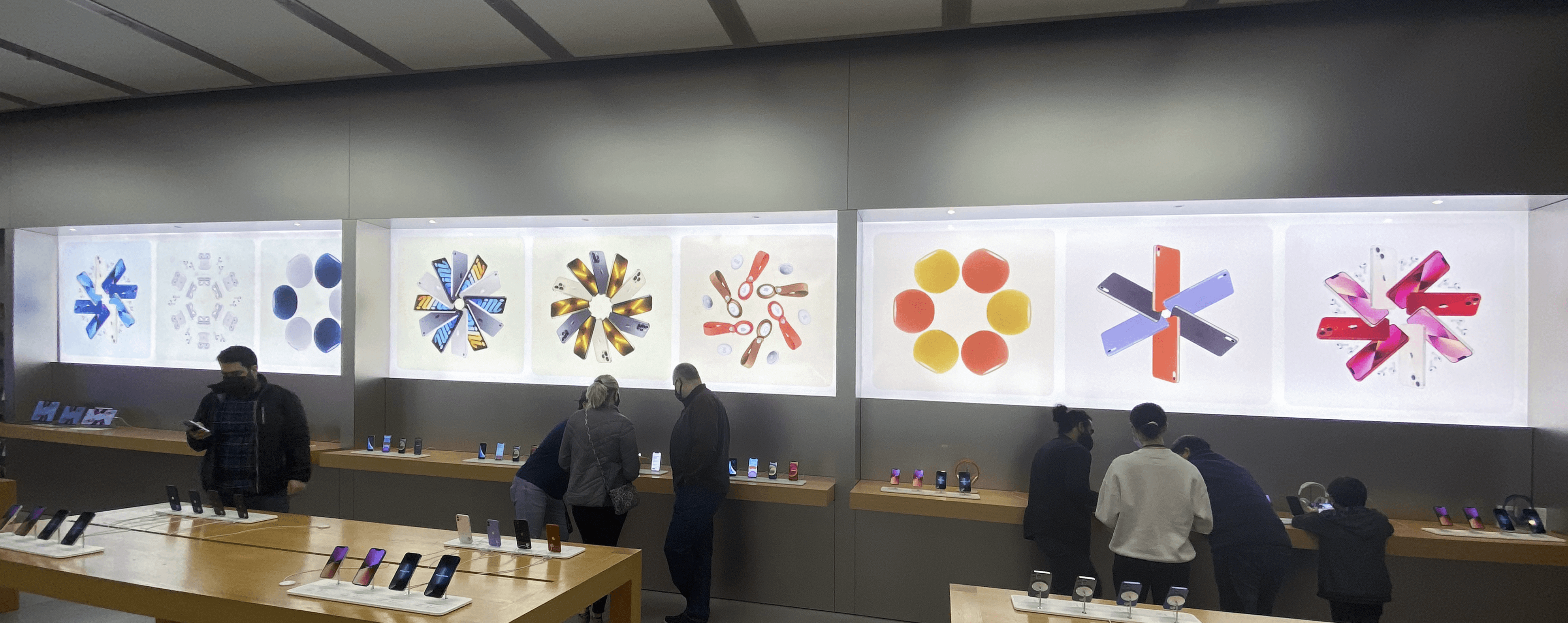 Seasonal campaign art direction, planning, and design for all 500+ Apple retail locations worldwide. Crafted a series of 30 unique "snowflake" designs showcasing Apple products, installed as lightbox display panels, and signage, to excite customers to make purchases during the holiday season. This campaign also extended into paid media and tv ad spots.